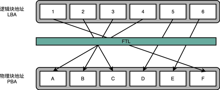 我们通过一个页表映射虚拟内存页和物理页,在 FTL 里面,存放了逻辑块地址(Logical Block Address,简称 LBA)到物理块地址(Physical Block Address,简称 PBA)的映射。