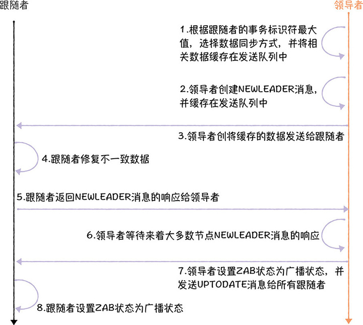 数据同步的流程 November 19, 2022 Content # 数据同步也是通过跟随者和领导者交互来完成的,目标是确保跟随者节点上的数据与领导者节点上数据是一致的。大概的实现流程,如图所示: Viewpoints # From # 加餐 | ZAB协议(二):如何从故障中恢复? Links #