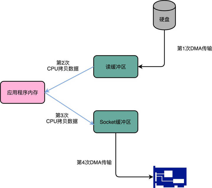 第一次,是通过 DMA,从硬盘直接读到操作系统内核的读缓冲区里面。第二次,则是根据 Socket 的描述符信息,直接从读缓冲区里面,写入到网卡的缓冲区里面。