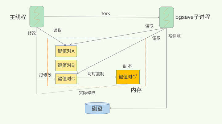 如果主线程要修改一块数据(例如图中的键值对 C),那么,这块数据就会被复制一份,生成该数据的副本(键值对 C’)。然后,主线程在这个数据副本上进行修改。同时,bgsave 子进程可以继续把原来的数据(键值对 C)写入 RDB 文件。