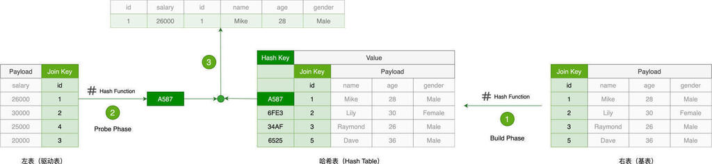在 Build 阶段,在基表之上,算法使用既定的哈希函数构建哈希表,如上图的步骤 1 所示。哈希表中的 Key 是 id 字段应用(Apply)哈希函数之后的哈希值,而哈希表的 Value 同时包含了原始的 Join Key(id 字段)和 Payload。