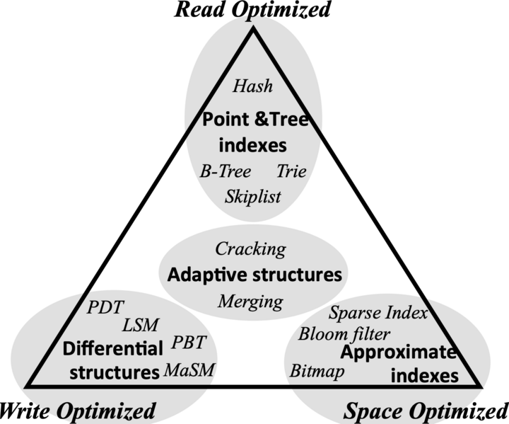 RUM 猜想来自论文“Designing Access Methods: The RUM Conjecture”(Manos Athanassoulis et al.(2016)),同时被 SIGMOD 和 EDBT 收录。它说的是,对任何数据结构来说,在 Read Overhead(读)、 Update Overhead(写) 和 Memory or Storage Overhead(存储) 中,同时优化两项时,需要以另一项劣化作为代价。论文用一幅图展示了常见数据结构在这三个优化方向中的位置。