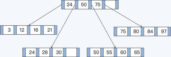 下面这张图中展示了一棵高度为 2 的 B+Tree,数据存储在 5 个页表中,每页可存放 4 条记录。略去了叶子节点指向数据的指针以及叶子节点之间的顺序指针。