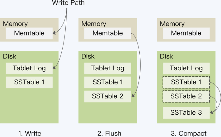 根据第二步的处理逻辑,Memtable 会周期性地产生 SSTable。当满足一定的规则时,这些 SSTable 会被合并为一个大的 SSTable。这个操作称为 Compact。