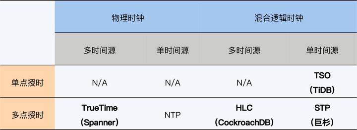 常见授时方案 November 28, 2022 Content # 区分授时机制抓住三个要素就可以了。 时间源:单个还是多个 使用的时钟类型:物理时钟还是混合逻辑时钟 授时点:一个还是多个 根据排列组合,一共产生了 8 种可能性,其中 NTP(Network Time Protocol)误差大,也不能保证单调递增,所以就没有单独使用 NTP 的产品;还有一些方案在实践中则是不适用的(N/A)。因此常见的方案主要只有 4 类。 Viewpoints # From # 05 | 全局时钟:物理时钟和逻辑时钟你Pick谁? Links #