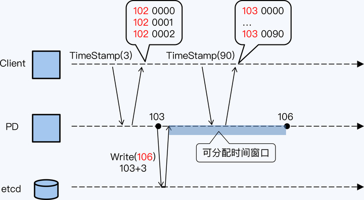 当前 PD(主节点)的系统时间是 103 毫秒,PD 向 etcd 申请了一个“可分配的时间窗口”。要知道时间窗口的跨度是可以通过参数指定的,系统的默认配置是 3 毫秒,示例采用了默认配置,所以这个窗口的起点是 PD 当前时间 103,时间窗口的终点就在 106 毫秒处。。写入 etcd 成功后,PD 将得到一个从 103 到 106 的“可分配时间窗口”,在这个时间窗口内 PD 可以使用系统的物理时间作为高位,拼接自己在内存中累加的逻辑时间,对外分配时间戳。