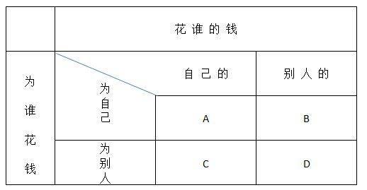 图中A是用自己的钱为自己花,比如在超级市场为自己买东西,既要省钱又要买得合算。这是最有效的花钱方式。B是为自己花别人的钱,比如可报销的用餐,你不会想着节约,但是会尽量使自己满意。C是为了别人花自己的钱。比如给朋友买礼物,你会想着节省但朋友喜欢什么你只能猜想,很可能花钱买了一个别人并不喜欢的礼物。D是你为别人花别人的钱。比如你负责审批一笔报销,你既不会想着节约,也不会考虑钱花得有没有效果,只要符合规定的报销制度就行。弗里德曼用这个矩阵说明“福利国家的谬论”,意思是说,花钱最好是自己花自己的钱。由国家来安排百姓的福利必然是低效的。他反对先征税,再由国家安排百姓的福利,比如教育、医疗、住房等。