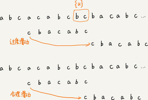 拿它在模式串中查找,如果找到了另一个跟{u}相匹配的子串{u*},那就将模式串滑动到子串{u*}与主串中{u}对齐的位置。
