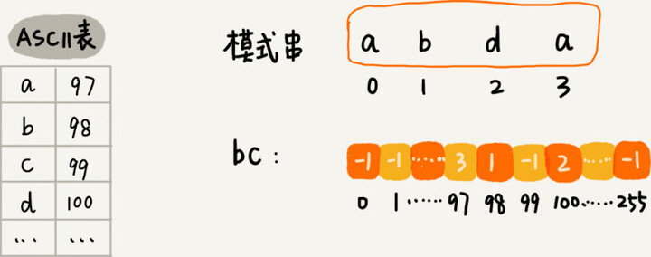 假设字符串的字符集不是很大,每个字符长度是 1 字节,用大小为 256 的数组,来记录每个字符在模式串中出现的位置。数组的下标对应字符的 ASCII 码值,数组中存储这个字符在模式串中出现的位置。