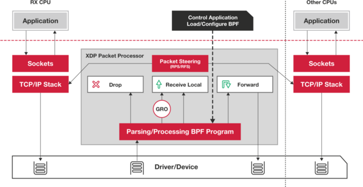 XDP 对内核的要求比较高,需要的是 Linux 4.8 以上版本,并且它也不提供缓存队列。基于 XDP 的应用程序通常是专用的网络应用,常见的有 IDS(入侵检测系统)、DDoS 防御、 cilium 容器网络插件等。