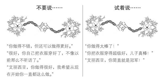 - 表达责任义务的强化行为。当我们对孩子说:“很好,艾丽西亚,我希望从现在开始你一直都这么做。”孩子的大脑会立即探测到这不仅仅是一个奖励,而且还对她提出了要求。这时孩子不仅不会感到开心,反而还会感到沮丧。