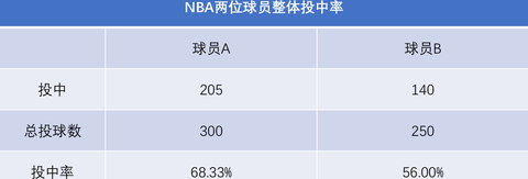 两分球和三分球投中率都比较高的这个球员 B,整体的命中率反而下降了,是不是让人有点大跌眼镜?如果你是篮球爱好者,你应该会发现问题,NBA 里没算过整体命中率,一般都是把二分球和三分球的命中率分开说的。