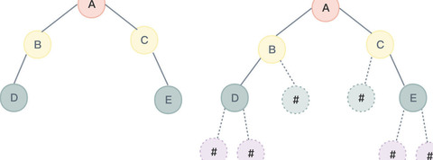 如果给出一个扩展二叉树的前序或后序遍历序列,是能够唯一确定一棵二叉树的。下图中,右侧的扩展二叉树的前序遍历序列为“ABD###C#E##”,通过这个序列是可以唯一确定下图左侧这个二叉树的。你不妨根据这个序列绘制一下对应的二叉树,看是否能够验证该结论的正确性。