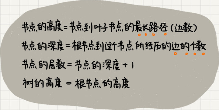 “层数”跟深度的计算类似,不过,计数起点是 1,也就是说根节点位于第 1 层。