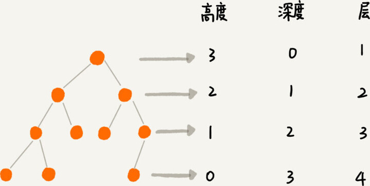 在我们的生活中,“高度”这个概念,其实就是从下往上度量,比如我们要度量第 10 层楼的高度、第 13 层楼的高度,起点都是地面。所以,树这种数据结构的高度也是一样,从最底层开始计数,并且计数的起点是 0。