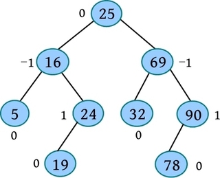 平衡二叉树或为空树,或为具有以下性质的平衡二叉树:① 左右子树高度差的绝对值不超过1;② 左右子树也是平衡二叉树。节点左右子树的高度之差被称为平衡因子。在二叉查找树中,每个节点的平衡因子的绝对值不超过1即平衡二叉树。例如,一棵平衡二叉树及其平衡因子如下图所示: