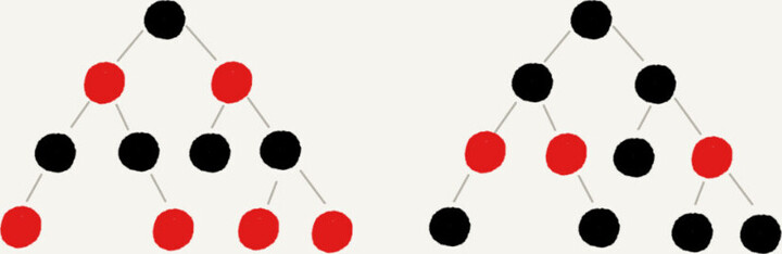 - 任何相邻的节点都不能同时为红色,也就是说,红色节点是被黑色节点隔开的;