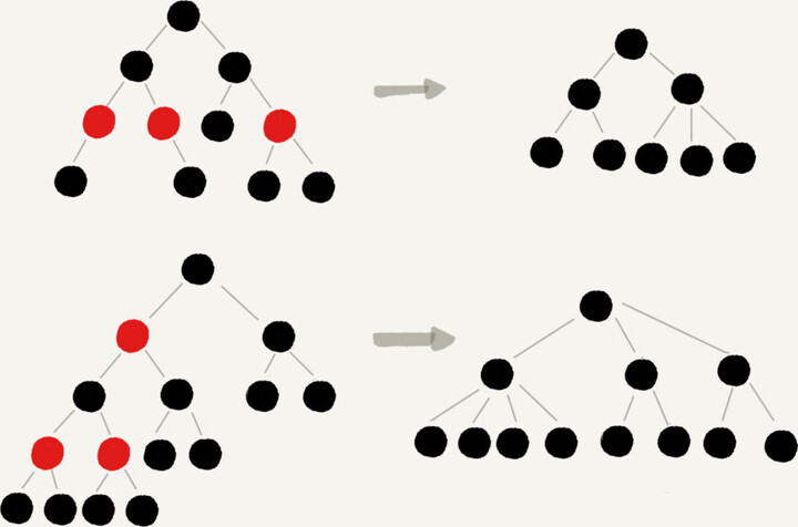 红色节点删除之后,有些节点就没有父节点了,它们会直接拿这些节点的祖父节点(父节点的父节点)作为父节点。所以,之前的二叉树就变成了四叉树。