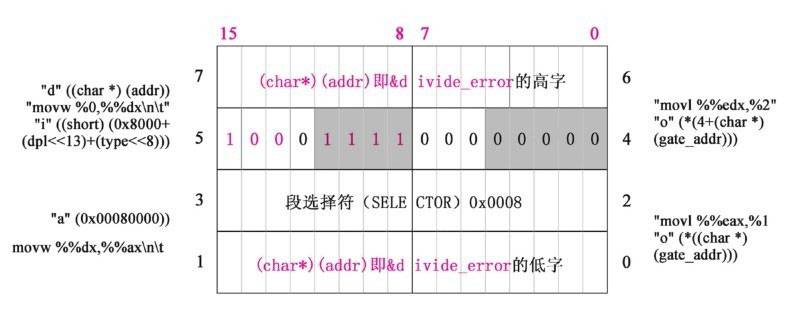 “movw %%dx,%%ax\n\t”是把edx的低字赋值给eax的低字; edx是(char *)(addr),也就是÷_error; eax的值是0x00080000,8应该看成1000,这样eax的值就是 0x00080000 +((char *)(addr)的低字),其中的0x0008是段选择符,