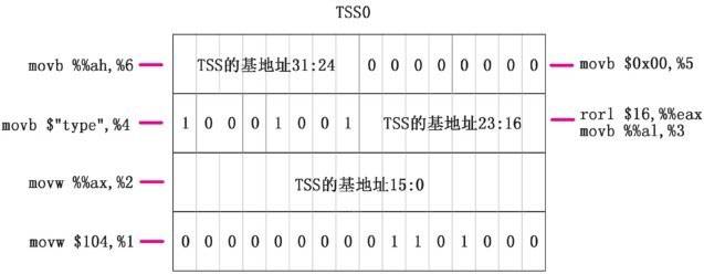 TSS的类型是0x89,即二进制的10001001,可以看出movb $" type “,%4在给type 赋值1001的同时,顺便将P、DPL、S字段都赋值好了。同理,movb $0x00,%5在给段限长19:16部分赋值0000的同时,顺便将G、D/B、保留、AVL字段都赋值好了。