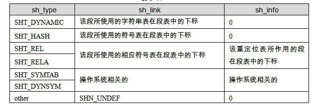 段的链接信息(sh_link、sh_info) 如果段的类型是与链接相关的(不论是动态链接或静态链接),比如重定位表、符号表等,那么sh_link和sh_info这两个成员所包含的意义如下表所示。对于其他类型的段,这两个成员没有意义。