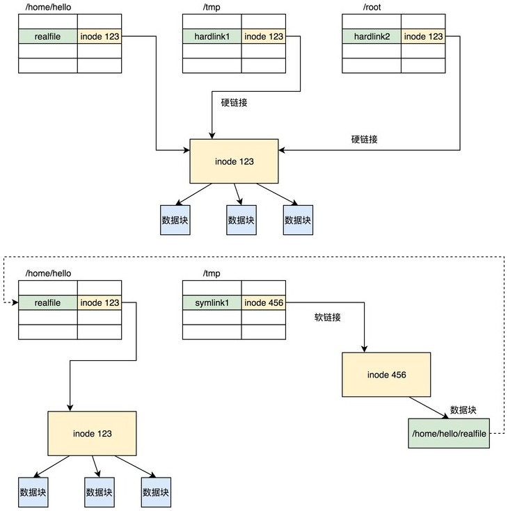 ln -s 创建的是软链接,不带 -s 创建的是硬链接。它们有什么区别呢?在文件系统里面是怎么保存的呢?