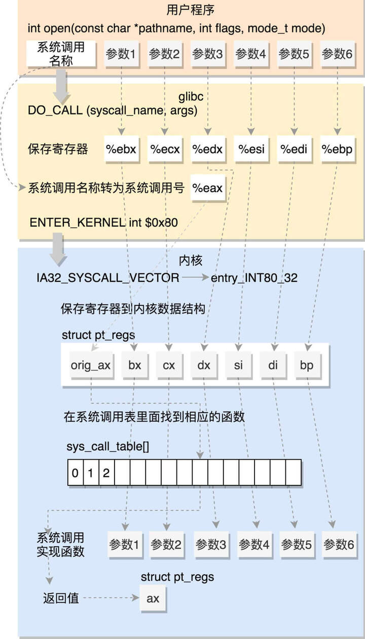 将请求参数放在寄存器里面,根据系统调用的名称,得到系统调用号,放在寄存器 eax 里面,然后执行 ENTER_KERNEL。
