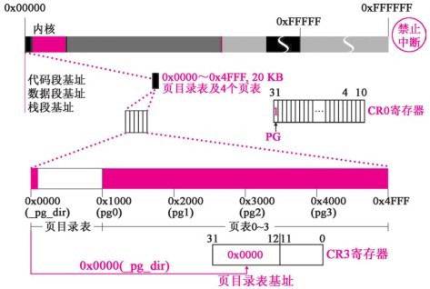 前两行代码的动作是将CR3指向页目录表,意味着操作系统认定0x0000这个位置就是页目录表的起始位置;后3行代码的动作是启动分页机制开关PG标志置位,以启用分页寻址模式。两个动作一气呵成。