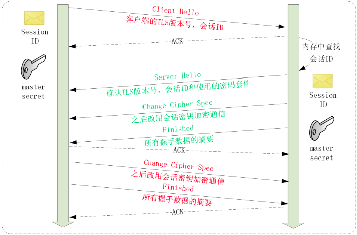 “Session ID”,就是客户端和服务器首次连接后各自保存一个会话的 ID 号,内存里存储主密钥和其他相关的信息。当客户端再次连接时发一个 ID 过来,服务器就在内存里找,找到就直接用主密钥恢复会话状态,跳过证书验证和密钥交换,只用一个消息往返就可以建立安全通信。