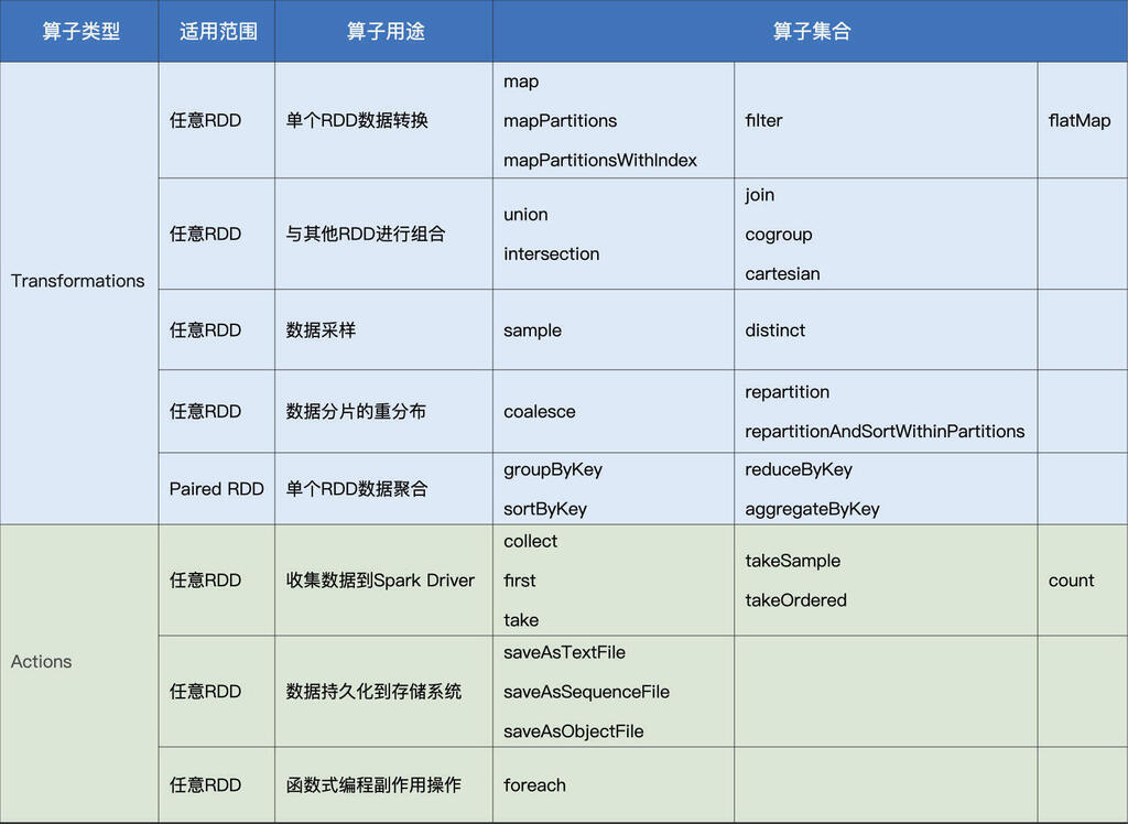 Transformations类算子和Actions类算子 October 26, 2023 Content # 在 RDD 的编程模型中,一共有两种算子,Transformations 类算子和 Actions 类算子。开发者需要使用 Transformations 类算子,定义并描述数据形态的转换过程,然后调用 Actions 类算子,将计算结果收集起来、或是物化到磁盘。 Viewpoints # From # 02 | RDD与编程模型:延迟计算是怎么回事? Links #