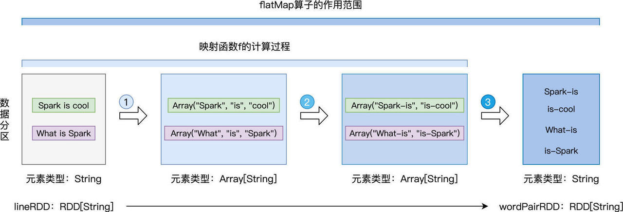 不难发现,映射函数 f 的计算过程,对应着图中的步骤 1 与步骤 2,每行文本都被转化为包含相邻词对的数组。紧接着,flatMap 去掉每个数组的“外包装”,提取出数组中类型为 String 的词对元素,然后以词对为单位,构建新的数据分区,如图中步骤 3 所示。这就是 flatMap 映射过程的第二步:去掉集合“外包装”,提取集合元素。