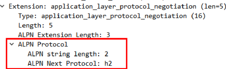 客户端在发起“Client Hello”握手的时候,后面会带上一个“ALPN”扩展,里面按照优先顺序列出客户端支持的应用协议。