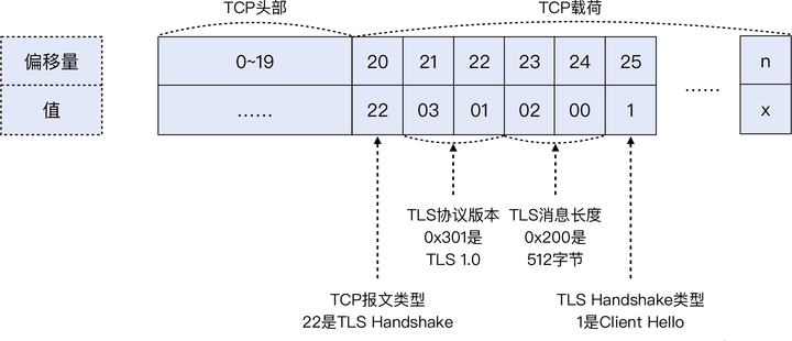 这是 TCP 头部的第 26 个字节,如果它等于 1,那么就表明这个是 Client Hello 类型的 TLS 握手报文。
