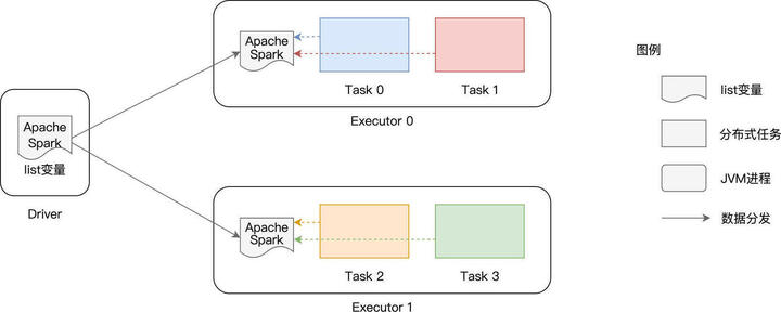 在使用广播变量之前,list 变量的分发是以 Task 为粒度的,而在使用广播变量之后,变量分发的粒度变成了以 Executors 为单位,同一个 Executor 内多个不同的 Tasks 只需访问同一份数据拷贝即可。换句话说,变量在网络中分发与存储的次数,从 RDD 的分区数量,锐减到了集群中 Executors 的个数。