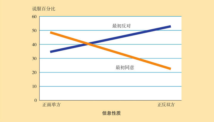 如图所示,信息的效果取决于说服对象。对那些已经持赞成态度的人来说,正面说服更有效;而认可并反驳反面观点的说服则对那些最初持反对意见的人更有效。