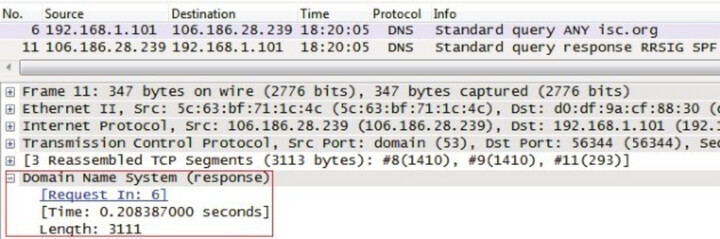 而11号包收到的回复却能达到3111字节(见下图底部的Length 3111),竟然放大了124倍。