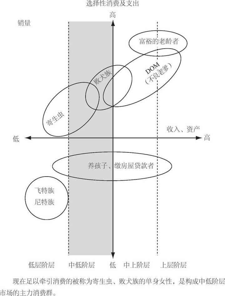 ◆ “寄生虫”是指没有收入,必须向别人伸手拿钱作为自己支出费用的人。“未婚、有工作、没有孩子”并和父母一起居住的人,就是最典型的寄生虫。现在35岁的女性中,有35%都是未婚的,而且有35%的人和父母住在一起。在美国,年过20还和父母住在一起的话,会被认为“很恶心”;但是在日本,属于这一部分的人数却在持续增加。这些人本身的收入属于中低阶层或低层阶层,但是由于不需负担家用,三餐靠父母,所以可用于选择性消费及支出的金钱相当宽裕。处于这个部分的人口数,据推算超过1200万人,而且预计20~39岁的人在这个部分所占的比例将会越来越高。