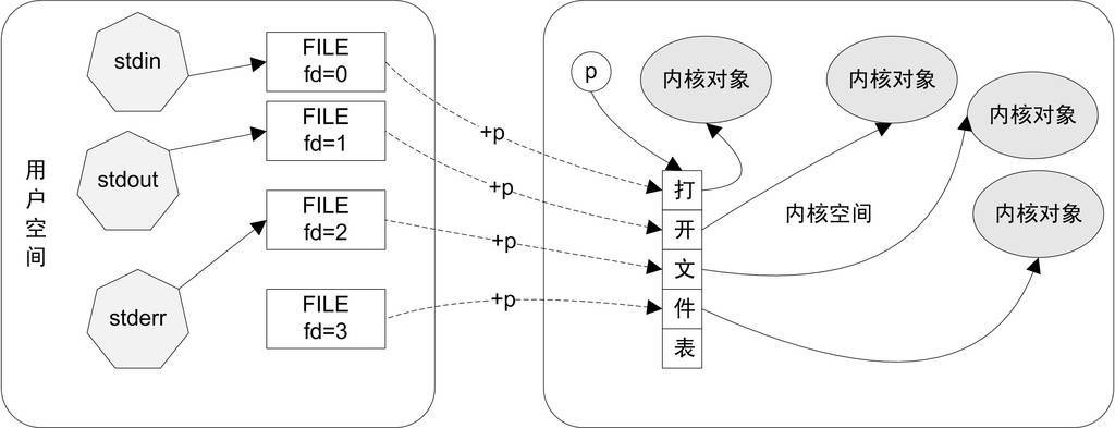 FILE、fd、打开文件表和打开文件对象的关系如图所示。
