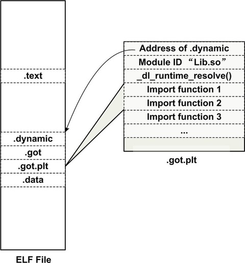 第一项保存的是“.dynamic”段的地址,这个段描述了本模块动态链接相关的信息,我们在后面还会介绍“.dynamic”段。第二项保存的是本模块的ID。第三项保存的是_dl_runtime_resolve()的地址。