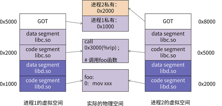 然后,进程 1 通过访问自己的 GOT 表,查到 foo 函数的地址是 0x1000,它就能真正地调用到 foo 函数了。进程 2 访问自己的 GOT 表,查到 foo 函数的地址是 0x2000,它也能顺利地调用 foo 函数。这样就通过引入了 GOT 这个间接层,解决了 call 指令和 foo 函数定义之间的偏移不固定的问题。