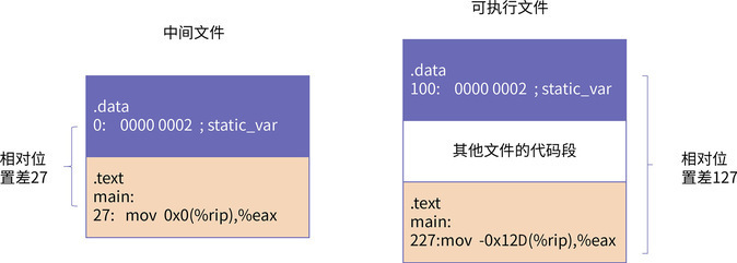 这是因为 static_var 变量本身是一个静态变量,只在本编译单元内可见,不会对外进行暴露,所以它是根据本编译单元的.data 段的地址来进行重定位。也就是说,static_var 的最终地址就是本编译单元的.data 段的最终地址。所以,它的重定义方法与 extern_var 等符号的重定位方法是一样的,区别仅仅在于它的符号被隐藏了。如下图所示: