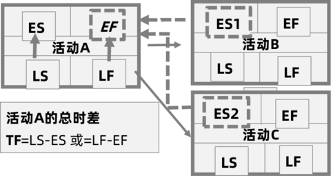 活动A的自由时差=min(ES1 - 活动A的EF, ES2 - 活动A的EF)